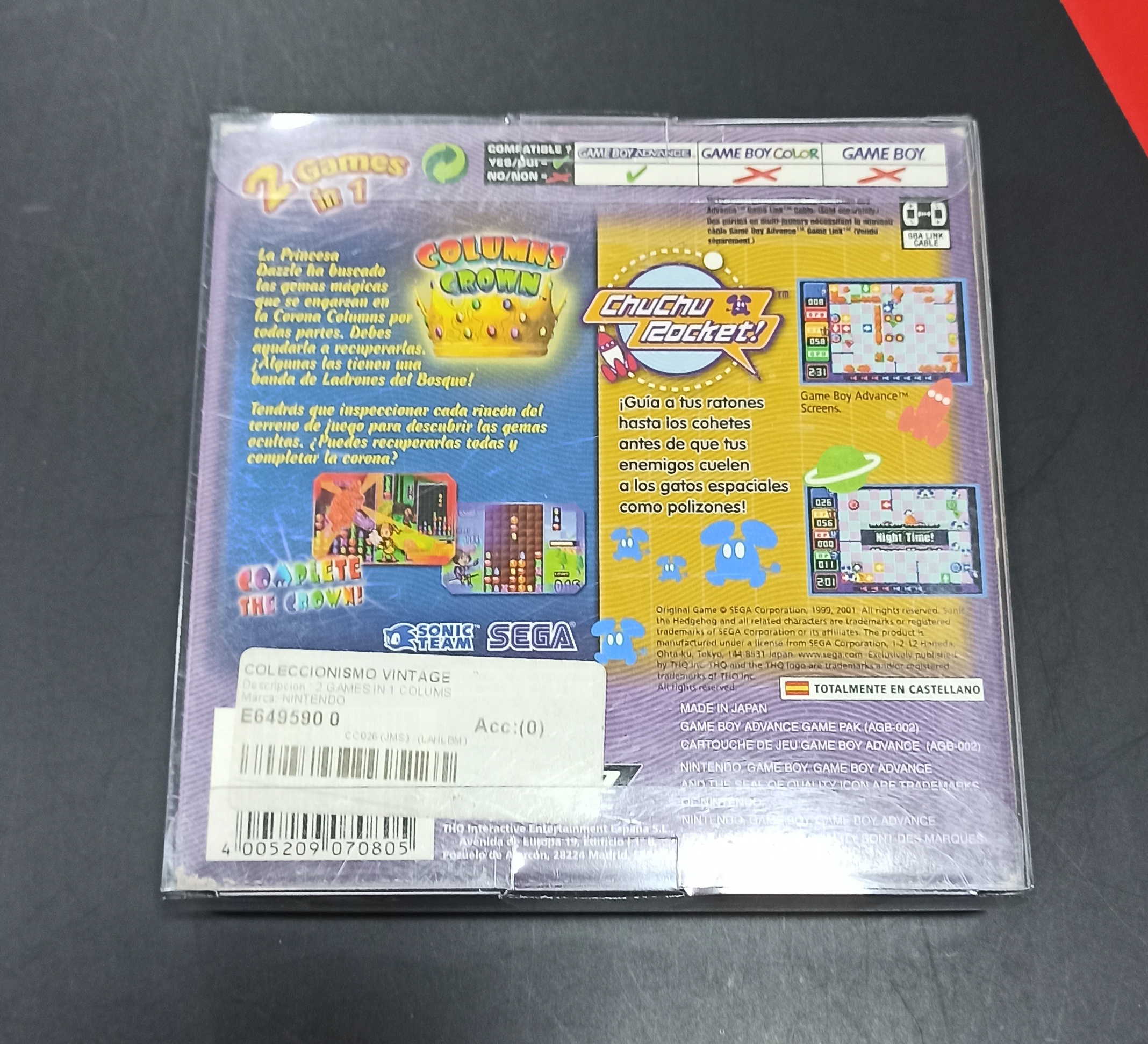Inicio / Juegos / COLUMNS CRON + CHUCHU ROCKET – 2 GAMES IN 1 COLUMNS CRON + CHUCHU ROCKET – 2 GAMES IN 130.00€ VERSION ESPAÑOLA CON MANUAL Solo quedan 1 disponibles COLUMNS CRON + CHUCHU ROCKET - 2 GAMES IN 1 cantidad Añadir al carrito Categoría: Juegos Información adicional Valoraciones (0) Información adicional Estado Ocasión Plataforma Nintendo Game Boy Advance Valoraciones No hay valoraciones aún. Sé el primero en valorar “COLUMNS CRON + CHUCHU ROCKET – 2 GAMES IN 1” Cancelar la respuestaTu dirección de correo electrónico no será publicada. Los campos obligatorios están marcados con *Nombre * Correo electrónico * Tu puntuación * Puntuar… Perfecto Bueno Normal No está tan mal Muy pobre Tu valoración * Guarda mi nombre, correo electrónico y web en este navegador para la próxima vez que comente. Productos relacionados Juegos GOD OF WAR III REMASTERIZADO Juegos INFAMOUS SECOND SON Juegos GRAN TURISMO SPORT Juegos CAPTAIN TOAD TREASURE TRACKER